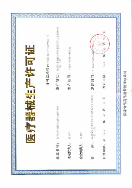 মান: Medical device manufacturing licenseসংখ্যা: XSYJXSCXB No.20091794প্রদানের তারিখ: 2019-01-10মেয়াদ শেষ হওয়ার তারিখ: 2024-01-09